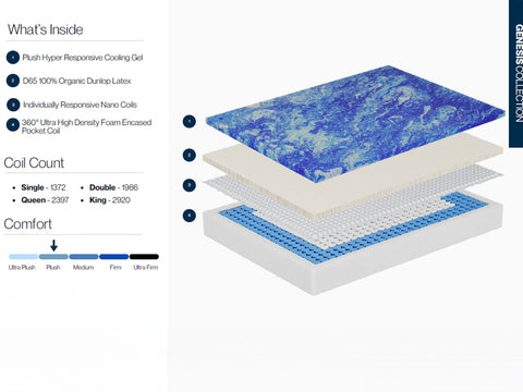 BRAND NEW FOR 2025! The GENESIS COLLECTION: HEVEA HYBRID is Made in Canada from Canadian foams by a single family-owned factory a features a coil-on-coil single sided design.